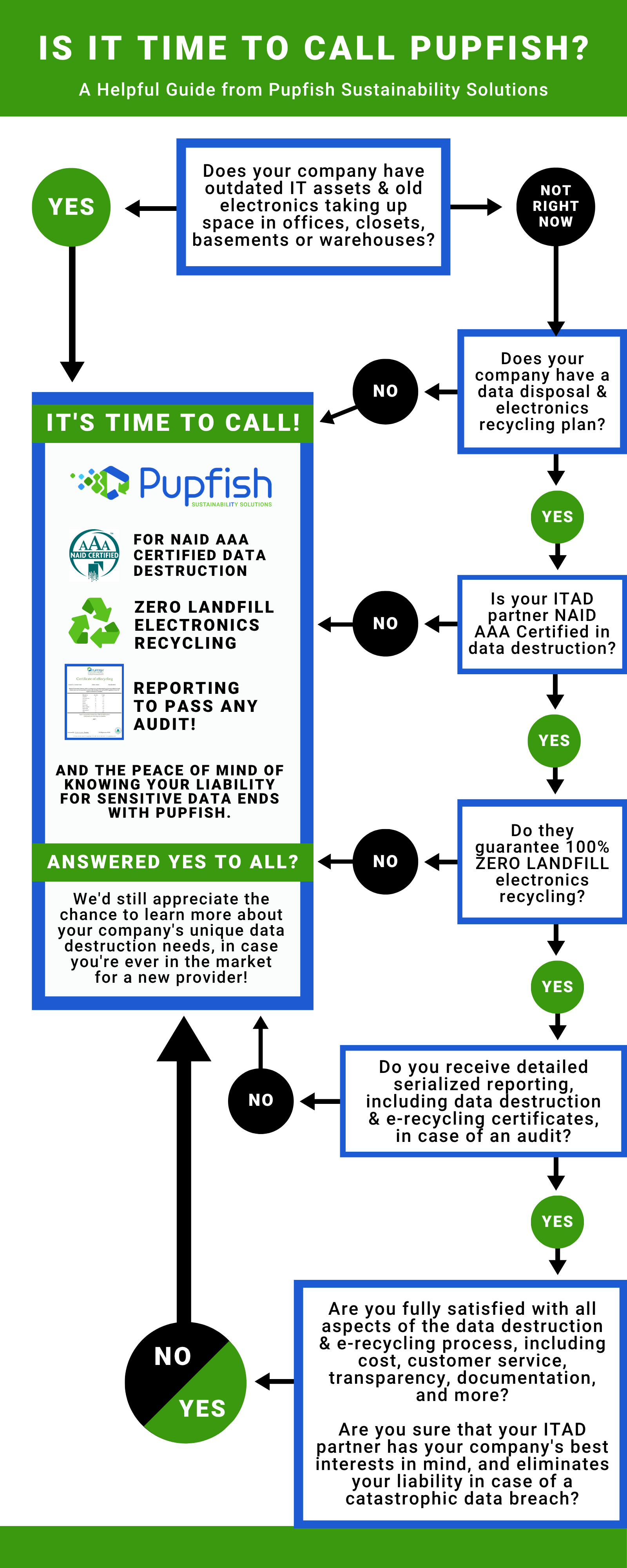 How do you know when it’s time to call a certified data destruction company, like Pupfish? There are some straightforward signs such as old electronics piling up in your company’s closets, office, or warehouse. But there are also less obvious and very important reasons to give Pupfish a call, such as: you want to be 100% sure your company is protected against a post-life data breach or a surprise audit.