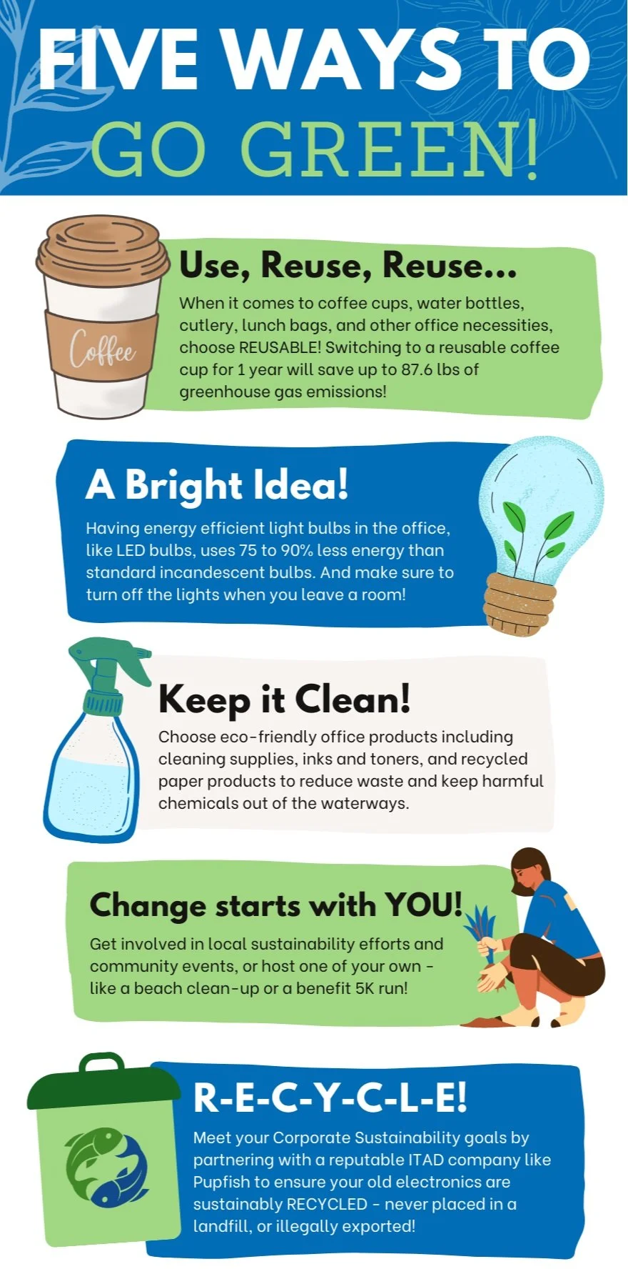 As a sustainably-minded data destruction and e-recycling company, we know that sustainability initiatives in the workplace start small, and they start with YOU. Here are listed some small steps companies can take towards going green that will yield huge progress towards realizing Corporate Sustainability goals.